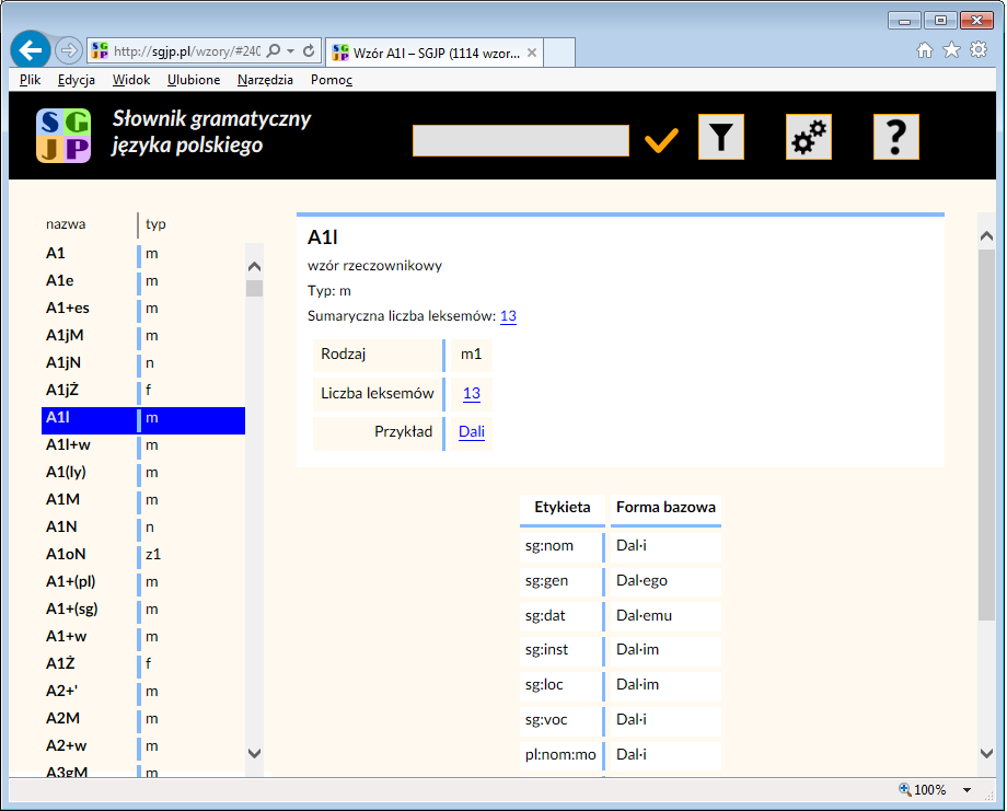 Natomiast kliknięcie w nazwę danego wzoru powoduje wyświetlenie informacji o tym wzorze — następuje przy tym zmiana widoku ogólnego na wzory fleksyjne.